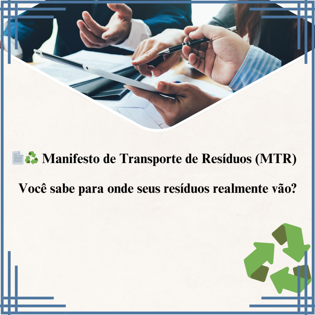 O Manifesto de Transporte de Resíduos (MTR) é um documento eletrônico obrigatório que acompanha o resíduo desde a sua geração até a destinação final.